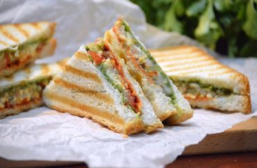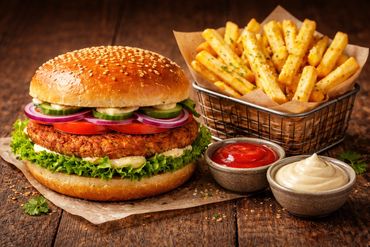 a perfectly toasted bun cradling a thick rustic patty bursting with visible bites of veggies topped with colourful fresh lettuce ruby tomatoes crisp onions and creamy drizzled sauce