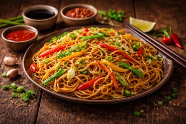a vibrant textural mix of golden grains colourful veggies glistening from soy sauces with a signature smoky aroma served in a rustic bowl
